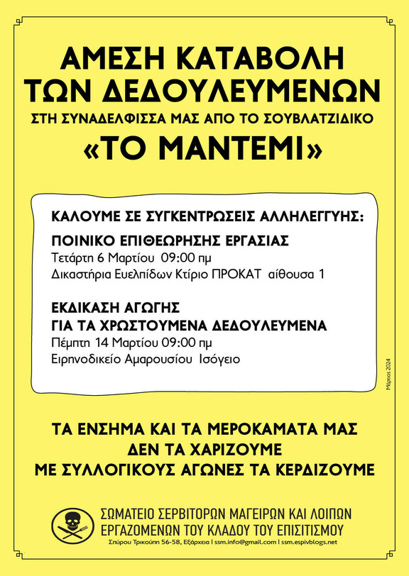 Το 2019 η συναδέλφισσά μας Π.Α. εργάστηκε στο συνοικιακό σουβλατζίδικο «ΤΟ ΜΑΝΤΕΜΙ» στην Πεύκη, με ένσημα λιγότερα και από τα μισά, δώρα ούτε για πλάκα, προσαυξήσεις νυχτερινής και κυριακάτικης εργασίας ανύπαρκτες και ούτε μία ημέρα νόμιμης άδειας. Η Π.Α. διεκδίκησε τα ένσημα της, τα δεδουλευμένα της και γενικότερα καλύτερες συνθήκες εργασίας, με αποτέλεσμα να απολυθεί.