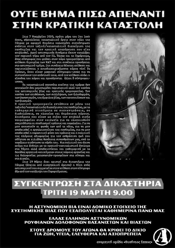 Στις 19 Μάρτη έχει οριστεί στα δικαστήρια της Πάτρας (έπειτα από εισαγγελική έρευνα) η δίκη ενός αστυνομικού που συμμετείχε στην επίθεση στον σύντροφο έξω από την κατάληψη του Παραρτήματος.