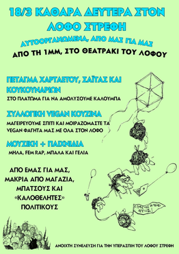 Μαζευόμαστε στο θεατράκι όπου θα έχει μπαρ, μουσική και παιχνίδια, ενώ το πέταγμα χαρταετού θα γίνει πιο ψηλά στο πλάτωμα. Καθώς το πλάτωμα δεν είναι εύκολα προσβάσιμο για άτομα με κινητικές δυσκολίες, παρακαλούμε επικοινωνήστε μαζί μας (lofosstrefi@riseup.net) να δούμε πώς μπορούμε να βοηθήσουμε για να μπορέσουμε όλα να ανεβούμε πάνω.