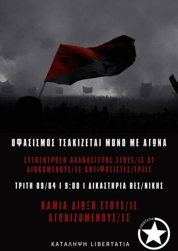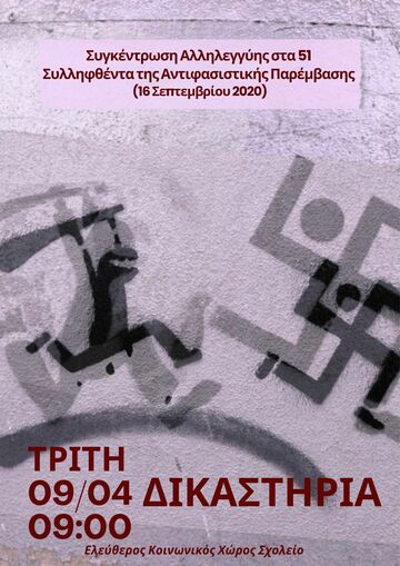 Συγκέντρωση αλληλεγγύης στους/ις 51 διωκόμενους/ες αντιφασίστες/τριες Ι Τρίτη 09/04 Ι 9:00 Ι Δικαστήρια Θεσσαλονίκης