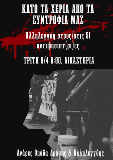 Την τρίτη 9/4 είναι η μέρα έναρξης της δίκης των 51 Αντιφασιστριών και αντιφασιστών. Θεωρούμε πολύ σημαντική την μαζική παρουσία του κινήματος που θα καταφέρει αυτή η σκευωρία που στήθηκε να καταπέσει και να αποδείξει ότι ο αντιφασισμός δεν δικάζεται και δεν καταστέλλεται. Από την συνεχόμενη παρουσία στις γειτονιές με συζητήσεις εκδηλώσεις και μοιράσματα κειμένων μέχρι τα τσακίσματα φασιστών όπου αυτοί τολμούν να εμφανιστούν για να δηλητηριάσουν με τον λόγο και τα σύμβολα τους ο αντιφασισμός ήταν είναι και θα είναι εδώ για να αναδεικνύει τον ρόλο που έχουν αυτά τα σιχάματα απέναντι στην πολυεθνική εργατική τάξη και πάντα με τα συμφέροντα του κεφαλαίου