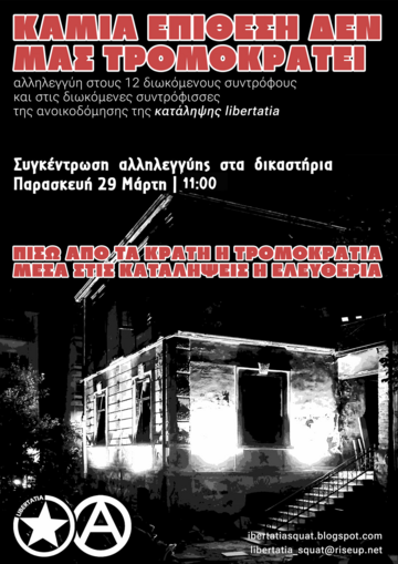 Την Παρασκευή 29/3 εκδικάζεται η περίπτωση ανοικοδόμησης της Libertatia όπου συνελήφθησαν 12 σύντροφοι και συντρόφισσες κατά τη διάρκεια εργασιών αποκατάστασης του κτηρίου μετά τον εμπρησμό του από φασίστες κατά τη διάρκεια μακεδονικού συλλαλητηρίου. Οι κατηγορίες με τις οποίες βρίσκονται αντιμέτωποι είναι αυτές της φθοράς μνημείου, της παράνομης δόμησης και της απείθειας. Κατηγορίες οι οποίες δεν μπορούν παρά να μας φαίνονται γελοίες, καθώς γνωρίζουμε πως προσάπτονται κατά το δοκούν. Αν το κράτος κοπτόταν για το μνημείο, γιατί δεν σταμάτησε τον εμπρησμό; Γιατί δεν έψαξε ποτέ να βρει τους υπαίτιους για αυτόν; Γιατί φορτώνει κατηγορίες μόνο στα υποκείμενα που επιλέγουν συλλογικά να αναδομούν τους αυτοοργανωμένους χώρους τους όταν χτυπιούνται; Μπορεί κάτι τέτοιο αρχικά να φαντάζει με αντίφαση, αλλά γνωρίζουμε πως στην πραγματικότητα το κράτος εντείνει την καταστολή και την πειθάρχησή του, απέναντι σε όσα άτομα επιδιώκουν να ζήσουν και να αλλάξουν τις ζωές τους με συλλογικούς τρόπους. Φροντίζει να επιτίθεται όλο και πιο έντονα σε κάθε αυτόνομη-αντιθεσμική δράση η οποία δεν φαίνεται να χωράει στα στενά πλαίσια της δημοκρατικής νομιμότητας. Και προσπαθεί πολύ να μας πείσει πως η μόνη κανονικότητα θα είναι η νομιμότητα, όταν βέβαια και η ίδια η αστική δικαιοσύνη προσφέρεται με συγκεκριμένους όρους και εξυπηρετεί συγκεκριμένα συμφέροντα (τα οποία δεν είναι τα δικά μας).
