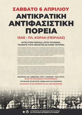 Συνέχεια ανοιχτής συνέλευσης για τη διοργάνωση αντικρατικής - αντιφασιστικής πορείας στον Πειραιά το Σάββατο 6 Απριλίου.