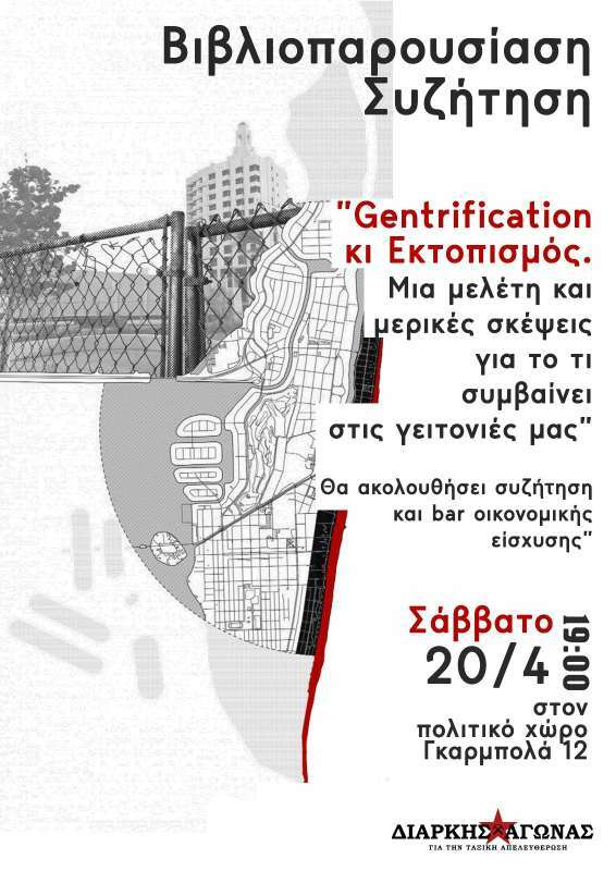 Παρουσίαση του βιβλίου "Gentrification κι Εκτοπισμός" (εκδόσεις "Δυσσήνιος Τύπος") και συζήτηση στον Πολιτικό χώρο του Διαρκούς Αγώνα για την ταξική απελευθέρωση Θεσσαλονίκης στη Γκαρμπολά 12.