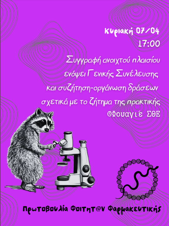 Παράλληλα με τη μακροχρόνια απαξίωση του τμήματος, τον κίνδυνο κλεισίματος που αντιμετωπίζει η σχολή μας, την έλλειψη διδασκόντων/-ουσών και την καθυστέρηση των πτυχιακών μας, την έλλειψη κτιρίου, μηχανημάτων και εξοπλισμού, την υποτίμηση της παιδείας και των ζωών μας από το κράτος με τον ψηφισμένο πλέον νόμο Πιερρακάκη, τις συλλήψεις και τις απειλές εναντίον φοιτητ@ν με διαγραφές για την υλοποίηση αποφάσεων των φοιτητικών τους Συλλόγων μέσω του βασικού οργάνου λήψης αποφάσεων, των Γενικών Συνελεύσεών τους, και την αστυνομική τρομοκρατία, το ζήτημα της εργασιακής μας εκμετάλλευσης στην πρακτική άσκηση έχει ξεπεράσει κάθε όριο.