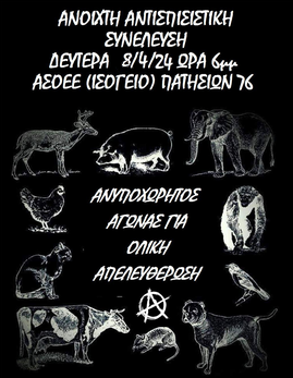 - Η συζήτηση γύρω από την οργάνωση δράσεων αναφορικά με την υπεράσπιση των ζώων, με άξονα την ολική απελευθέρωση και υπό το πρίσμα του αντισπισισμού.