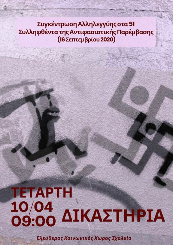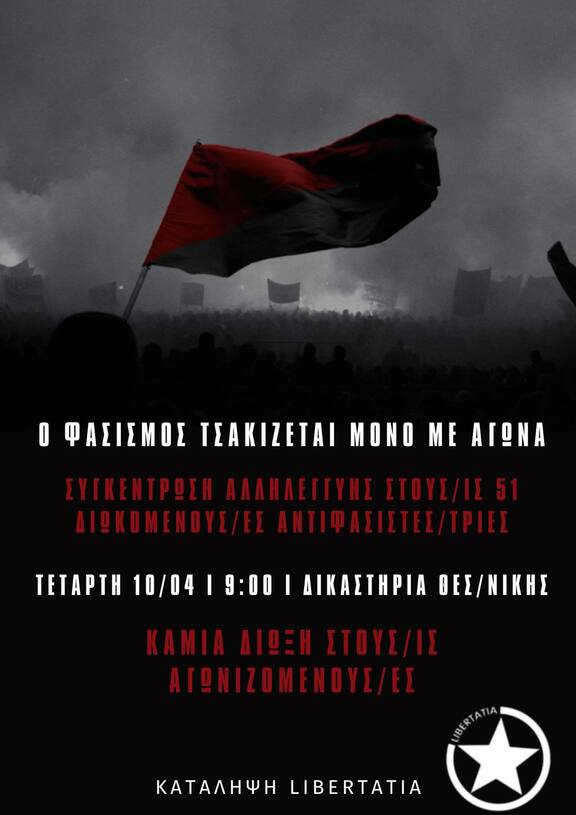 Την τρίτη 9/4 είναι η μέρα έναρξης της δίκης των 51 Αντιφασιστριών και αντιφασιστών. Θεωρούμε πολύ σημαντική την μαζική παρουσία του κινήματος που θα καταφέρει αυτή η σκευωρία που στήθηκε να καταπέσει και να αποδείξει ότι ο αντιφασισμός δεν δικάζεται και δεν καταστέλλεται. Από την συνεχόμενη παρουσία στις γειτονιές με συζητήσεις εκδηλώσεις και μοιράσματα κειμένων μέχρι τα τσακίσματα φασιστών όπου αυτοί τολμούν να εμφανιστούν για να δηλητηριάσουν με τον λόγο και τα σύμβολα τους ο αντιφασισμός ήταν είναι και θα είναι εδώ για να αναδεικνύει τον ρόλο που έχουν αυτά τα σιχάματα απέναντι στην πολυεθνική εργατική τάξη και πάντα με τα συμφέροντα του κεφαλαίου
