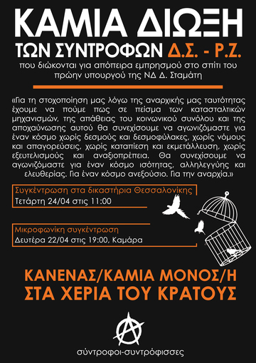 Έπειτα από 4 χρόνια αναβολών και στοχοποίησης των συντρόφων από τα ένστολα καθάρματα, στις 24 Απριλίου του 2024 ξεκινάει η δίκη στα δικαστήρια Θεσσαλονικης, με ενα κατηγορητήριο, το οποίο οι σύντροφοι εξαρχής αρνουνται και μόνο στόχο έχει να τρομοκρατήσει τον Δ.Σ τον Ρ.Ζ. , τον κόσμο του αγώνα, αλλα και να ποινικοποίησει τις συντροφικές σχέσεις. Εμείς ξέρουμε πολύ καλά πως μπάτσοι, δικαστές και κρατος δεν θα καταφέρουν ποτέ να μας τρομοκρατήσουν, όσοι ποινικοί και σωφρονιστικοί κώδικες και αν ψηφιστούν, όσο και αν προσπαθούν να μας καταστειλουν. Θα στεκόμαστε πάντα απέναντι στο κράτος και τους μηχανισμούς καταπίεσης που αυτό επιβάλλει.