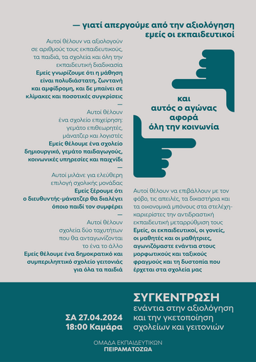 🗣️ Ανοίγουμε τον λόγο μας προς τα έξω. Επικοινωνούμε σε όλη την κοινωνία τι είναι επιτέλους αυτή η αξιολόγηση στην οποία ορκίζεται το Υπουργείο και γιατί θα βγούνε όλοι χαμένοι εάν παγιωθεί στην εκπαιδευτική πραγματικότητα. Ενημερώνουμε όσες και όσους ξέρουμε να στηρίξουν τη μάχη ενάντια στην αποσάθρωση της δημόσιας εκπαίδευσης.