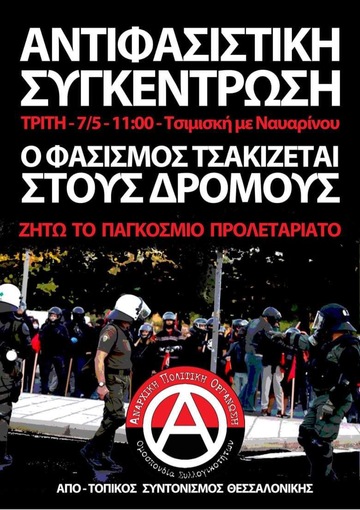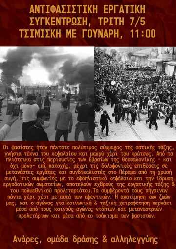 Κάλεσμα σε αντιφασιστική εργατική συγκέντρωση, Τρίτη 7/5 , Τσιμική με Γούναρη στις 11:00 πμ