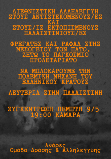 Μετά απο 7 μήνες που το Ισραήλ δεν έχει σταματήσει να σφυροκοπά η αντίσταση του Παλαιστινιακού λαού είναι παρούσα να μας θυμίζει πως τίποτα δεν έχει τελειώσει. Το πολύμορφο κύμα αλληλεγγύης που ξεσπά σε κάθε γωνιά του πλανήτη είναι πιο αναγκαίο από ποτέ. Από τις αντιπολεμικές καταλήψεις σε δεκάδες πανεπιστήμια σε Ευρώπη και Αμερική μέχρι τις επιθετικές ενέργειες σε επιχειρήσεις και δομές Ισραηλινών συμφερόντων ήρθε η στιγμή να βγούμε μαχητικά στους δρόμους και να μεταφέρουμε τον πόλεμο αυτό μέσα στις μητροπόλεις των δυτικών κρατών που συμμετέχουν σε αυτή την γενοκτονία. Με διεθνιστική αλληλεγγύη και παίρνοντας θέση μάχης στον κοινωνικό πόλεμο που μαίνεται θα φωνάζουμε μέχρι τέλους
