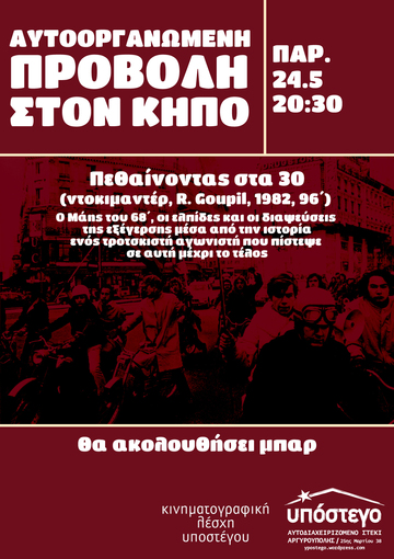 Την Παρασκευή 24.5 η 1η για φέτος θερινή προβολή στον κήπο του Υποστέγου, το ντοκιμαντέρ Πεθαίνοντας στα 30 (1982, 96′, Romain Goupil).
