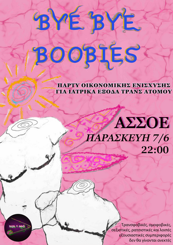 Party οικονομικής ενίσχυσης για έξοδα top surgery, από την αναρχοκουήρ κολλεκτίβα non+sed. Όλα τα έσοδα ανεξαιρέτως θα βοηθήσουν trans άτομο να πραγματοποιήσει το χειρουργείο το οποίο θα το κάνει να νιώσει επιτέλους λιγότερη δυσφορία με το σώμα του και θα το βοηθήσει ψυχολογικά.