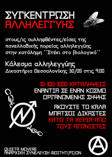 Εμείς, ως δομή αλληλεγγύης σε φυλακισμένα και διωκόμενα συντρόφια, που στεγαζόμασταν μάλιστα τα τελευταία χρόνια στο κατειλημμένο στέκι στο βιολογικό, εκφράζουμε την αμέριστη αλληλεγγύη μας στα 23 συλληφθέντα και καλούμε σε συγκέντρωση αλληλεγγύης την Πέμπτη 30/05 στις 09:00 στα δικαστήρια Θεσσαλονίκης, όπου θα πραγματοποιηθεί η δίκη.