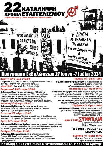 22 χρόνια Κατάληψη Ευαγγελισμού Πρόγραμμα εκδηλώσεων 27/6-7/7/24