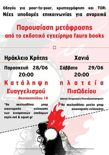 Εκδήλωση - Παρουσίαση μετάφρασης "Οδηγός για Peer-to-Peer, Κρυπτογράφηση, και TOR: νέες υποδομές επικοινωνίας για αναρχικά" από το εκδοτικό εγχείρημα faura books.