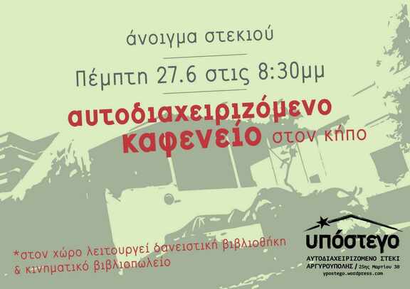 Την Πέμπτη 27 Ιουνίου στις 20:30, το στέκι ανοίγει με αυτοδιαχειριζόμενο καφενείο στον κήπο.