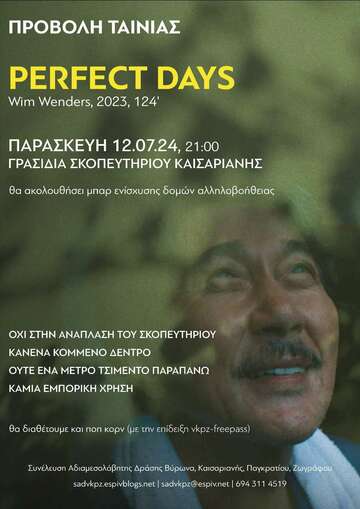 Την Παρασκευή 12 Ιουλίου, στα Γρασίδια του Σκοπευτηρίου Καισαριανής, στις 9 το βράδυ θα προβάλουμε την ταινία "Perfect Days" ("Υπέροχες Μέρες") του Wim Wenders, παραγωγής 2023 και διάρκειας 124 λεπτών. Αμέσως μετά, θα ακολουθήσει μπαρ ενίσχυσης δομών αλληλοβοήθειας. Η προβολή γίνεται στο πλαίσιο απόφασης της συνέλευσής μας για την παρουσίαση πρόσφατων ποιοτικών ταινιών χωρίς αντίτιμο και την οικιοποίηση των δημόσιων χώρων. Ειδικά αυτή την περίοδο που το Σκοπευτήριο βρίσκεται σε καθεστώς ανάπλασης που, κυρίως, προβλέπει την κοπή δέντρων, την τσιμεντοποίηση και την εμπορευματικοποίηση του Άλσους, η προβολή αποκτά και τον χαρακτήρα της αντίδρασής μας σ΄αυτά τα σχέδια.