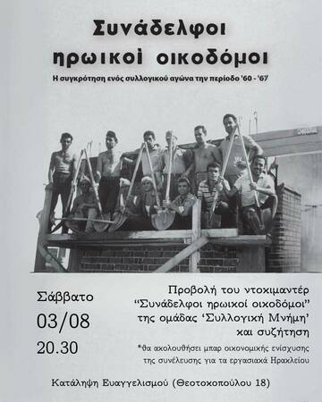 Προβολή του ντοκιμαντέρ "Συνάδελφοι ηρωικοί οικοδόμοι" της ομάδας "Συλλογική Μνήμη", απο τη συνεύλευση για τα εργασιακά Ηρακλείου.