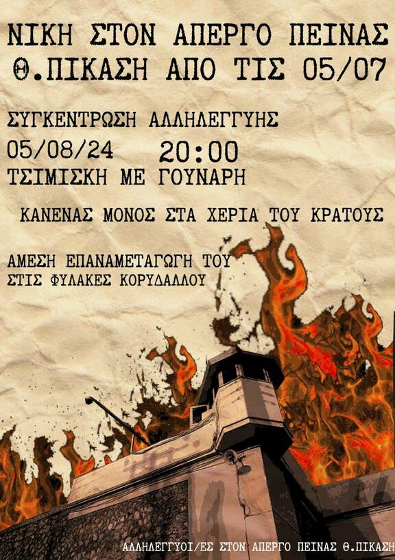 Συγκέντρωση αλληλεγγύης στον απεργό πείνας Θανάση Πικάση, Δευτέρα 5/8, Τσιμισκή με Γούναρη, 20:00