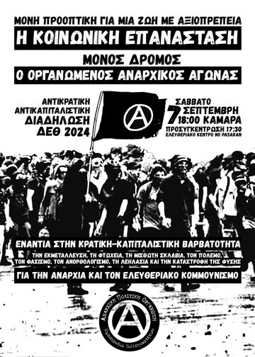 Απέναντι στην οργανωμένη επίθεση του κράτους και του κεφαλαίου, η μόνη λύση βρίσκεται στην Οργάνωση του αγώνα των καταπιεσμένων και εκμεταλλευόμενων. Μέσα από αδιαμεσολάβητους αντιιεραρχικούς και ακηδεμόνευτους αγώνες από τα κάτω, μπορούμε να περάσουμε στην αντεπίθεση ενάντια στην εκμετάλλευση και την καταπίεση, να παλέψουμε για την κοινωνική επανάσταση. Να ξαναφτιάξουμε τη ζωή με βασικά συστατικά την κοινωνική αλληλεγγύη, τη συνεργασία, χωρίς αφεντικά και δούλους. Να κάνουμε απτή πραγματικότητα τη γενικευμένη κοινωνική Αυτοδιεύθυνση, να συνοψίσουμε την πολιτική ελευθερία και την οικονομική ισότητα στο σύγχρονο επαναστατικό πρόγραμμα. Για ένα ελευθεριακό κίνημα όλων των εκμεταλλευόμενων και των καταπιεσμένων που θα δίνει διέξοδο στις πραγματικές ανάγκες.