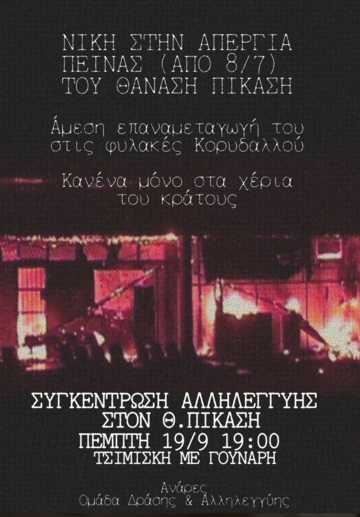 Καλούμε κάθε αγωνιζόμενο υποκείμενο να σταθεί στο πλευρό αυτού του αγώνα, γιατί η ζωή κάθε κρατουμένου μετράει. Ενάντια στις μεθοδεύσεις των ανθρωποφυλάκων, ενάντια στην ατέρμονη τιμωρία όσων δε σκύβουν το κεφάλι ακόμα και μέσα στα κελιά, ενάντια σε κάθε απόπειρα οι φυλακές να μετατραπούν σε τάφους νεκροζώντανων ανθρώπων. Καλούμε σε πανελλαδική μέρα δράσης, για την αλληλεγγύη στον αγώνα του απεργού πείνας Θανάση Πικάση-την Πέμπτη 19 Σεπτέμβρη, για να εκφράσουμε με πράξεις το συλλογικό πάθος για την Ελευθερία.