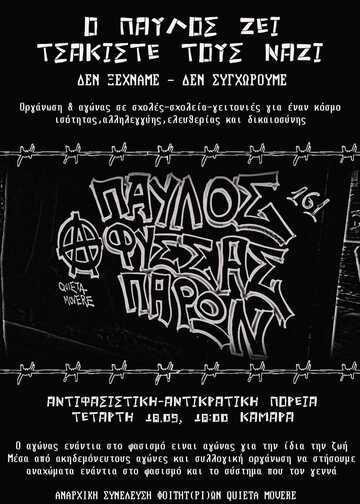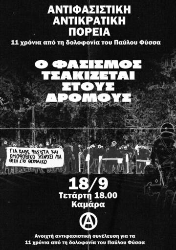 Η συμπλήρωση 11 χρόνων από την δολοφονία του Παύλου Φύσσα μας βρίσκει σε μια κοινωνική συγκυρία στην οποία το αντιφασιστικό κίνημα καλείται να δώσει και πάλι καθημερινές μάχες σε διάφορα μέτωπα . Μπορεί η Χρυσή Αυγή , το ναζιστικό μόρφωμα - κύριος εκφραστής της ακροδεξιάς στα προηγούμενα χρόνια- να έχει υποχωρήσει όμως τα αντιμεταναστευτικά πογκρόμ και τα pushbacks , η διάχυτη κοινωνική βία σε βάρος τρανς, κουιρ ατόμων από φασιστικές γκρούπες και το γενικότερο ρατσιστικό πλαίσιο που αποτελεί δομικό στοιχείο του καπιταλιστικού συστήματος είναι ακόμα εδώ. Τις "δουλειές" που άλλοτε το κράτος ανέθετε στα τάγματα εφόδου της χρυσής αυγής πλέον είναι σε θέση να τις φέρει μόνος του εις πέρας, ντύνοντας τες με μια τρόπον τινά κοινωνική νομιμοποίηση για την διατήρηση της κανονικότητας στην λειτουργία της καπιταλιστικής μηχανής. Η ρατσιστική κρατική προπαγάνδα είναι αυτή που στρώνει το έδαφος ώστε Ρομά, μετανάστριες και λοιπές ομάδες που δεν ταιριάζουν στο εθνικό αφήγημα της χώρας να δέχονται καθημερινό πόλεμο σε κάθε πτυχή της ζωής τους. Δεν είναι πλέον οι δολοφόνοι της χρυσής αυγής που σκοτώνουν εν ψυχρώ τον Πακιστανό εργάτη Σαχζάτ Λουκμάν αλλά τα ένστολα καθάρματα της ΕΛΑΣ που εκτελούν τους ανήλικους Ρομά Σαμπάνη, Φραγκούλη, Μιχαλόπουλο και τον Σύριο μετανάστη Καλαφ Ασαντ. Δεν είναι κάποια ναζιστικά σκουπίδια της χρυσής αυγής που σπάνε πάγκους Ρομά και Αφρικανών μικροπωλητών στην λαϊκή της Ξηροκρήνης αλλά αυτό αποτελεί πλέον εξαγγελία και αρμοδιότητα της τοπικής αυτοδιοίκησης της πόλης.