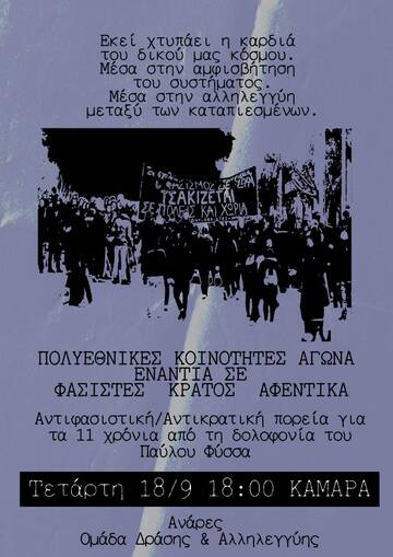 Καλούμε όλους/ες στην πορεία για τα 11 χρόνια από τη δολοφονία του Π. Φύσσα, Τετάρτη 18/09 :