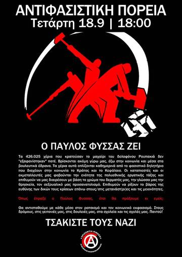 Στην πορεία της 18ης Σεπτεμβρίου, λοιπόν ο αντιφασίστας Παύλος Φύσσας και η επέτειος της δολοφονίας του είναι για εμάς απλά η αφορμή για να βρεθούμε στον δρόμο. Γιατί τα πραγματικά αίτια είναι εδώ , ολοζώντανα και πιο καθαρά από ποτέ. Το αντιφασιστικό κίνημα οφείλει, ως κομμάτι του ευρύτερου ανταγωνιστικού κινήματος, να μπολιαστεί με αμιγώς ταξικά χαρακτηριστικά και να δώσει τις απαντήσεις που αρμόζουν τόσο στις φασιστικές τάσεις του σήμερα αλλά και γενικότερα στο σύστημα που τις θρέφει και τις κανονικοποιεί. Οφείλουμε να είμαστε εκεί για να πιάσουμε το νήμα των αδιαμεσολάβητων αντιφασιστικών αγώνων του χθες και να τους φέρουμε στο σήμερα. Να συνδεθούμε με τις καταπιεσμένες ομάδες και να κάνουμε πράξη τις μαχητικές κοινότητες αγώνα ενάντια στον φασισμό. Να διαρρήξουμε το αφήγημα της εθνικής ενότητας που επιδιώκουν κράτος και φασίστες σε όλα τα κοινωνικά πεδία , από τα σχολεία μέχρι τους χώρους εργασίας, και να φωτίσουμε τα σημεία καταπίεσης με κατεύθυνση την ταξική συνείδηση που οφείλει να έχει ένα, από τα κάτω , αντιφασιστικό κίνημα. Να αγωνιστούμε από κοινού με τον μετανάστη συνάδελφο μας ενάντια στην καθημερινή μας εκμετάλλευση από τα αφεντικά. Να σπάσουμε την μονοτονία των επετειακών πορειών και να κάνουμε τους αγώνες μας επικίνδυνους στο σήμερα.