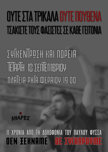Έχουν περάσει 11 χρόνια από τη δολοφονία του 34χρονου Παύλου Φύσσα. Η βίαιη δράση του ναζιστικού μορφώματος της Χρυσής Αυγής ήταν ήδη φανερή από το 2012 με επιθέσεις και απόπειρες ανθρωποκτονίας ενάντια σε μετανάστ(ρι)ες, που οδήγησαν και στη δολοφονία του 27χρονου εργαζόμενου μετανάστη Σαχζάτ Λουκμάν στις 17/01/2013. Ξημερώματα της 18ης Σεπτεμβρίου 2013 τουλάχιστον 20 μέλη της ναζιστικής οργάνωσης έστησαν ενέδρα στον Παύλο και την παρέα του στην Αμφιάλη Κερατσινίου. Εκείνος δεν λύγισε και μπήκε μπροστά προσπαθώντας να διευκολύνει τους φίλους του να διαφύγουν πρώτοι, ώσπου ο 45χρονος φασίστας Γιώργος Ρουπακιάς τον μαχαίρωσε στην καρδιά.