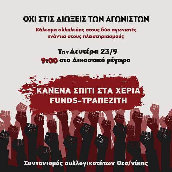 Ο ΣΥΝΤΟΝΙΣΜΟΣ ΣΥΛΛΟΓΙΚΟΤΗΤΩΝ ΘΕΣΑΛΟΝΙΚΗΣ καλεί όλους/ες στο Δικαστικό Μέγαρο Θεσσαλονίκης τη Δευτέρα 23 του Σεπτέμβρη, στις 9π.μ. να δηλώσουμε την αλληλεγγύη μας στους δυο αγωνιστές ενάντια στους πλειστηριασμούς που δικάζονται, να απαιτήσουμε την αθώωσή τους και να διατρανώσουμε την αποφασιστικότητά μας να αγωνιστούμε ενάντια στη λεηλασία της λαϊκής κατοικίας και περιουσίας, όπως κάναμε και πρόσφατα για άλλη μια φορά έξω από τα γραφεία της DoValue.