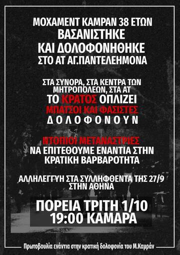 ΠΟΡΕΙΑ για τη ρατσιστική κρατική δολοφονία του μετανάστη Mohammed Kamran στο Α.Τ. Αγ. Παντελεήμονα, ΤΡΙΤΗ 1/10, ΚΑΜΑΡΑ 19:00