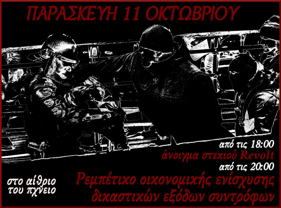 Την Παρασκευή 11/10 στο αίθριο του Πολυτεχνείου, στις 6μμ,θα γίνει άνοιγμα του στεκιού revolt και στις 8μμ θα ακολουθήσει ρεμπέτικο γλέντι για την οικονομική ενίσχυση των δικαστικών εξόδων συντρόφων.