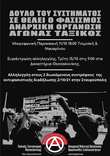 Αντιφασιστική μικροφωνική αλληλεγγύης στους δύο διωκόμενους αναρχικούς-αντιφασίστες συντρόφους την Παρασκευή 11/10, 18:00, Τσιμισκή & Ναυαρίνου