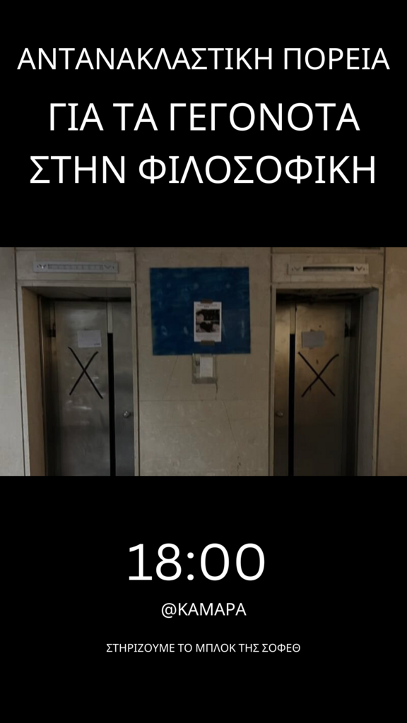 Σήμερα, 10 Οκτώβρη ο ΣΟΦΕΘ μετά την γενική συνέλευση που πραγματοποιήθηκε αποφάσισε να διαμαρτυρηθεί στον πρύτανη για την κατάσταση στις εστίες και συγκεκριμένα για το περιστατικό με το ασανσέρ που πλέον έχει γίνει πανελλαδικά γνωστό και που από τύχη δεν υπήρχε κάποιο άτομο μέσα. Η αντιμετώπιση του πρύτανη ήταν εξοργιστική καθώς δεν ανέλαβε καμία ευθύνη και μας αντιμετώπισε με χλευασμό και απειλές. Εμείς ζητούσαμε απλά το αυτονόητο, δηλαδή να εξασφαλιστεί ότι θα αντικατασταθούν όλα τα ασανσέρ άμεσα! Σαν να μην έφτανε αυτό μετά από κάποια ώρα μπάτσοι εισέβαλλαν στην παλια φιλοσοφική όπου βρισκόμασταν με τον πρύτανη, χτύπησαν και προσήγαγαν φοιτητές και φοιτήτριες που ζητούσαν το αυτονόητο. Δεν είναι η πρώτη φορά που λέμε για την κατάσταση στις εστίες. Ο συλλογός μας έχει τοποθετηθεί πολλές φορές για τις άθλιες συνθήκες διαβίωσης και κάθε φορά οι υπεύθυνοι αδιαφορούν. Έχουμε πει άπειρες φορές για τα προβλήματα συντήρησης που αντιμετωπίζουν τα κτίρια, για την κακή ποιότητα σίτισης κλπ. Ξεκάθαρα υπεύθυνοι για όλα αυτά είναι το κράτος , η πρυτανεία, το ΙΝΕΔΙΒΙΜ και η διεύθυνση των εστιών. Η καταστολή δεν πρόκειται ούτε να μας φοβίσουν ούτε τίποτα. Αντίθετα μας εξοργίζει παραπάνω το γεγονός ότι επιβεβαιώνεται η στάση της πρυτανείας και όλων των υπευθύνων απέναντί μας. Δηλαδή λήρης αδιαφορία για τις συνθήκες διαβίωσης μας. Δεν έχουμε τίποτα να χάσουμε και δεν θα σταματήσουμε να αγωνιζόμαστε.
