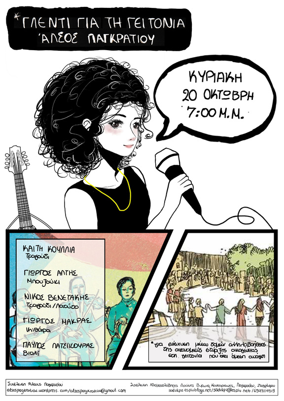 Οι Συνελεύσεις Αδιαμεσολάβητης Δράσης Βύρωνα, Καισαριανής, Παγκρατίου, Ζωγράφου και Άλσους Παγκρατίου διοργανώνουν Γλέντι για τη Γειτονιά με την Καίτη Κουλλιά και την ορχήστρα της. Το Γλέντι που θα πραγματοποιηθεί στο Άλσος Παγκρατίου (στρογγυλή πλατεία) από τις 7 το απόγευμα μέχρι τις 11 το βράδυ θα κινηθεί ανάμεσα σε παραδοσιακά, έντεχνα και λαϊκά τραγούδια και θα διαθέτει μπαρ και πολύ χορό.