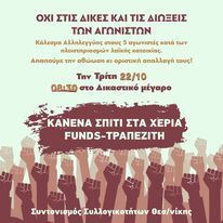 Ό,τι κι αν κάνουν όμως, όσο κι αν προσπαθούν να εξαντλήσουν το κίνημα αλληλεγγύης εμείς ανανεώσαμε το ραντεβού μας, με νέο κάλεσμα του ΣΥ.Σ.Θ για την Τρίτη 22 Οκτώβρη, στις 8,30π.μ. στο δικαστικό μέγαρο Θεσσαλονίκης.