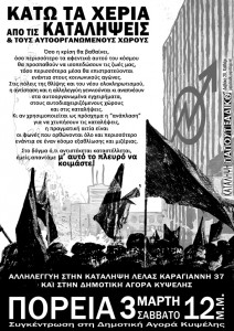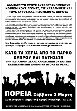 Συγκέντρωση και πορεία αλληλεγγύης προς τις καταλήψεις Λέλας Καραγιάννη και Δημοτικής Αγοράς Κυψέλης θα πραγματοποιηθεί αύριο Σάββατο 3 Μάρτη. Το ραντεβού είναι στις 12 στην Δημοτική Αγορά Κυψέλης στην οδό Φωκίωνος Νέγρη. Σε μια χρονική συγκυρία που οι καταλήψεις και οι αυτοδιαχειριζόμενοι χώροι τίθενται στο στόχαστρο των αρχών, οι άνθρωποι που τις εμψυχώνουν, έχουν να πουν μια κουβέντα μόνο: Κάτω τα χέρια από τις καταλήψεις, τους αυτοδιαχειριζόμενους χώρους και τους ακηδεμόνευτους αγώνες.