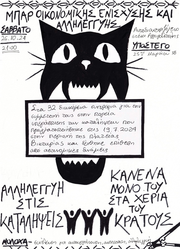 Το Σάββατο 26/10 στις 21:00 θα πραγματοποιηθεί μπαρ οικονομικής ενίσχυσης για τα 32 διωκόμενα συντρόφια για την πορεία υπεράσπισης των καταλήψεων στις 19/7/2024. Το μπαρ θα γίνει στο Αυτοδιαχειριζόμενο Στέκι Αργυρούπολης Υπόστεγο (25ης Μαρτίου 38).