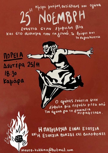 Η 25η Νοέμβρη, καθιερωμένη ήδη από το 1981 από γυναικείες οργανώσεις προς τιμήν των τριών αδελφών Μεραμπάλ (πολιτικών αγωνιστριών ενάντια στο δικτατορικό καθεστώς Τρουχίλο στην Δομινικανή Δημοκρατία) κατοχυρώνεται θεσμικά ως διεθνής ημέρα για την εξάλειψη της βίας κατά των γυναικών από τον ΟΗΕ (17/12/1999). Η καθιέρωση παγκόσμιων ημερών όπως η 25η Νοέμβρη, η 8η Μάρτη και άλλες, αποτελεί συστηματική τακτική θεσμών και κράτους με στόχο την αφομοίωση και τον κατευνασμό αγώνων και κινημάτων. Το κράτος υπό το προσωπείο της πρόνοιας και της κοινωνικής πολιτικής για την καταπολέμηση προβλημάτων που στην πράξη πηγάζουν από τις ίδιες τις εξουσιαστικές δομές του και συντηρούνται με την συνδρομή του και κυρίως με την υπονόμευση και καταπίεση των αγώνων ενάντιά τους, επιχειρεί να ρίξει στάχτη στα μάτια της κοινωνίας και να αμβλύνει τις αντιστάσεις της. Απέναντι σε αυτή την πρακτική οφείλουμε να υψώσουμε τις φωνές μας και να επανανοηματοδοτήσουμε αυτή την ημέρα όχι ως ημέρα θρήνου, αλλά ημέρα αντίστασης ενάντια στην έμφυλη βία οποιασδήποτε μορφής, ως ημέρα αντιπατριαρχικού αγώνα. Ενός αγώνα διαρκή στο εδώ και στο τώρα, με το βλέμμα στο μέλλον και τον νου στην ιστορία της έμφυλης καταπίεσης.