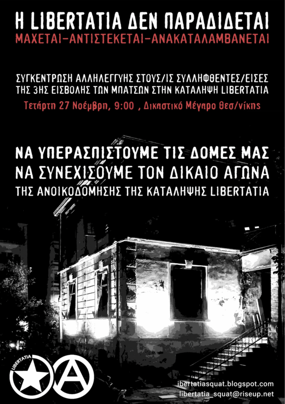 Τετάρτη, 27 Νοέμβρη, στις 9:00, Δικαστήρια Θεσσαλονίκης για την υπόθεση της τρίτης αστυνομικής εισβολής στην κατάληψη Libertatia