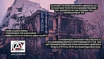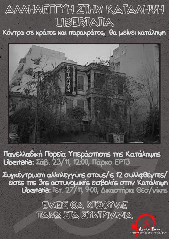 Οι αγώνες για την υπεράσπιση των καταλήψεων απέναντι στην τρομοκρατία κράτους και κεφαλαίου συνεχίζονται, καθώς οι καταλήψεις δεν παραδίνονται, αλλά μάχονται, αντιστέκονται, ανοικοδομούνται κι ανακαταλαμβάνονται. Έτσι, καλούμε σε πανελλαδική μέρα υπεράσπισης της κατάληψης Libertatia και των κατειλημμένων δομών αγώνα το Σάββατο 23 Νοεμβρίου και σε πορεία την ίδια μέρα στις 12.00 στο πάρκο απέναντι από την ΕΡΤ3. Την ίδια μέρα θα ακολουθήσει εκδήλωση για τον αγώνα της ανοικοδόμησης στις 18.00 στον ΕΚΧ Σχολείο, ενώ την Τετάρτη 27/11 στις 09.00 εκδικάζεται η υπόθεση της τρίτης κατά σειρά εισβολής της αστυνομίας ενάντια στον αγώνα της ανοικοδόμησης, που είχε σαν αποτέλεσμα 12 συλλήψεις για το αδίκημα της παράνομης επέμβασης σε διατηρητέο κτίριο και της αντίστασης κατά της αρχής.