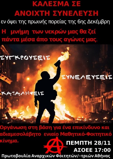 Για να διατηρήσουμε την εξεγερσιακή και επαναστατική μνήμη των αγώνων που έγιναν, για να δηλώσουμε σαφώς σε όλους τους τόνους πως η αναρχία είναι δυναμικά παρούσα, παρά τις προσπάθειες της καταστολής, καλούμε σε συνέλευση για την συγκρότηση αναρχικού φοιτητικού μπλοκ στην πρωινή πορεία της 6ης Δεκέμβρη, την Πέμπτη 28/11 στις 17:00, στην ΑΣΟΕΕ.