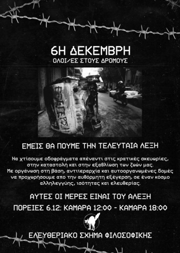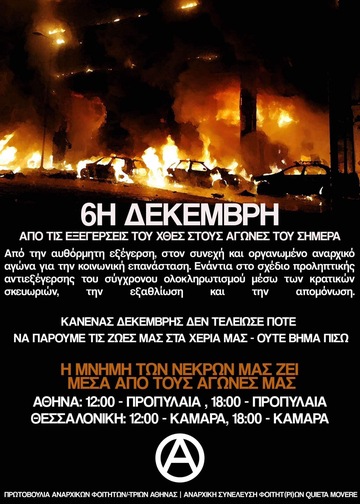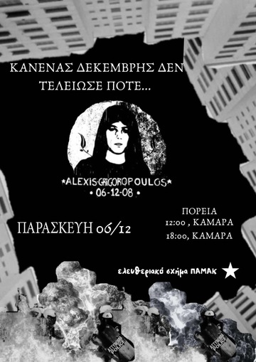 16 χρόνια μετά, βρισκόμαστε εδω να φωνάζουμε ΝΑ ΜΗΝ ΣΥΝΗΘΙΣΟΥΜΕ ΤΟΝ ΘΑΝΑΤΟ! Ο Δεκέμβρης του '08 και η λύσσα των εξεγερμένων έρχονται αφενός να αποτελέσουν ζωντανή μνήμη για εμάς, μιας νύχτας, μιας αρχής μιας εξέγερσης που κλόνισε τα θεμέλια της εξουσίας και δημιούργησε μια ρωγμή στον χρόνο. Αποτελεί αφετέρου μια σπίθα που πυροδοτεί τους δικούς μας αγώνες και που μας δείχνει πως ενάντια σε κράτος και θεσμούς του εμείς μπορούμε να ονειρευόμαστε και να "πλάθουμε ουτοπίες" ισότητας και αλληλεγγύης, ορθώνοντας οδοφράγματα και δρώντας αυτοοργανωμένα και συλλογικά. 16 χρόνια μετά, το αίμα δεν είναι νερό και η μνήμη δεν είναι σκουπίδι, η εξέγερση είναι πάντα δίκαιη!