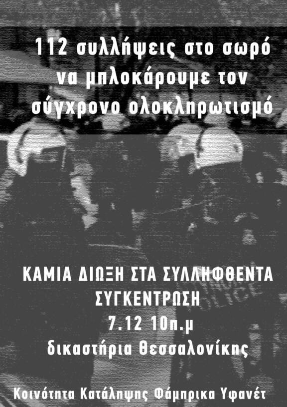 Κάλεσμα αλληλεγγύης στις/στους/στα 110 συλληφθείσσες/έντες/έντα Σάββατο 7/12 στις 10:00 στα Δικαστήρια Θεσσαλονίκης