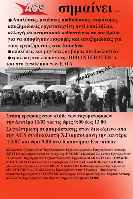 Η ACS είναι η μεγαλύτερη εταιρεία στον κλάδο ταχυμεταφοράς - ταχυδρόμησης, ανήκει στον όμιλο INFO-QUEST του Θ. Φέσσα αντιπροέδρου του ΣΕΒ και είναι μια από τις 400 πιο κερδοφόρες εταιρείες στην Ελλάδα, με κέρδη πάνω από 5 εκατομμύρια ευρώ μέσα στην κρίση! Είναι η εταιρεία που εισήγαγε τα franchise στον κλάδο αυτό στα τέλη της δεκαετίας του '90 και τώρα με πρόσχημα το μνημόνιο πρωτοστατεί στην απορύθμιση των εργασιακών σχέσεων και στο χτύπημα των εργασιακών δικαιωμάτων, επιβάλλοντας στους εργαζόμενους στα franchise μείωση μισθού, απολύσεις, εργασία με μπλοκάκι, αλλά και χτύπημα της επιχειρησιακής σύμβασης για τους εργαζόμενους της μητρικής. Βρισκόμαστε άλλωστε μπροστά στην απελευθέρωση της ταχυδρομικής αγοράς και η ACS θέλει να "καθαρίσει" για το σύνολο των εργοδοτών του κλάδου. Θέλουν μισθούς 500 ευρώ, χωρίς συμβάσεις και δικαιώματα και ταυτόχρονα να πάρουν την δουλεία από το δημόσιο ταχυδρομείο.