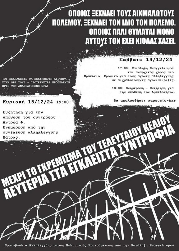 17:00: Κατάληψη Ευαγγελισμού και αναρχικός χώρος στο Ηράκλειο. Χρονικό για τους αγώνες αλληλεγγύης σε αιχμάλωτους/ες αγωνιστ(ρι)ές.