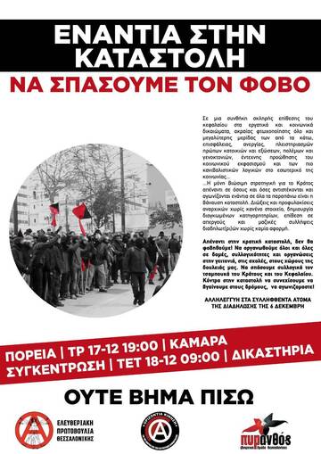 Την 6η Δεκέμβρη, ημέρα της επετείου των 16 χρονών από την κρατική δολοφονία του Αλέξανδρου Γρηγορόπουλου από τον ένστολο φονιά Κορκονέα, πραγματοποιήθηκε για μια ακόμα φορά ένα κατασταλτικό όργιο από τους συναδέλφους του φονιά. Με την ολοκλήρωση της πορείας στην Καμάρα, τα ΜΑΤ επιτέθηκαν εντελώς αναίτια στους διαδηλωτές που αποχωρούσαν από την Ναυρίνου, κυνηγώντας κόσμο σχεδόν σε όλη την πόλη χωρίς σταματημό, και συλλαμβάνοντας τελικά 112 άτομα με τη γελοία κατηγορία της διατάραξης κοινής ειρήνης. Την επόμενη μέρα, δεν δίστασαν να επιτεθούν, επίσης χωρίς κανένα λόγο, στους συγκεντρωμένους αλληλέγγυους και συγγενείς των συλληφθέντων έξω από τα Δικαστήρια Θεσσαλονίκης. Μία εβδομάδα πριν οι μπάτσοι έκαναν "προληπτικές προσαγωγές" σε απεργούς τη μέρα της απεργίας, ενώ προσπάθησαν ακόμα και να σταματήσουν απεργιακή προσυγκέντρωση την ώρα που κινούνταν προς την συγκέντρωση της Καμάρας. Τους τελευταίους μήνες ζούμε μια τεράστια όξυνση της κρατικής καταστολής με αποκλεισμούς των χώρων συγκεντρώσεων, προληπτικές προσαγωγές ανθρώπων που πηγαίνουν προς την πορεία, αστυνομικές επιθέσεις και μαζικές συλλήψεις για το τίποτα. Ο στόχοι προφανείς: η χαρτογράφηση του αναρχικού χώρου, η ομηρία εκατοντάδων αγωνιστών και αγωνιστριών μέσω των εκκρεμών δικών και η διάχυση του φόβου σε όσους και όσες συνεχίζουν να αντιστέκονται και να διαδηλώνουν.