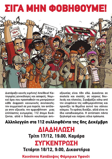 Στις 6 Δεκεμβρίου, 112 άτομα συνελήφθησαν από την αστυνομία και πέρασαν το βράδυ τους στη ΓΑΔΘ, για να οδηγηθούν την επόμενη μέρα στην εισαγγελία. Το έγκλημα τους; Το γεγονός ότι αποφάσισαν να σπάσουν τον φόβο, να συναντηθούν με φίλες και συντρόφια, να κατέβουν στην πορεία της επετείου της δολοφονίας του Γρηγορόπουλου και να αντισταθούν στην ζοφερή πραγματικότητα που βιώνουν. Όπως και κάθε άλλη φορά, το σύστημα για να δικαιολογήσει τον αυταρχισμό του διαστρεβλώνει την πραγματικότητα ώστε αυτή να ταιριάζει με το καθεστώς καταστολής και φόβου που επιβάλλει. Τα ΜΜΕ έγραψαν περί «διατάραξης κοινής ειρήνης, κατασκευής και κατοχής εκρηκτικών υλών, απόπειρας επικίνδυνης σωματικής βλάβης κατά υπαλλήλου κατά την εκτέλεση της υπηρεσίας του, προσβολής συμβόλων ή τόπων ιδιαίτερης εθνικής ή θρησκευτικής σημασίας, φθοράς, παράβασης Νομοθεσίας περί εξαρτησιογόνων ουσιών, περί όπλων και παράβασης Νομοθεσίας περί φωτοβολίδων και πυροτεχνημάτων». Αυτή η περιγραφή δημιουργεί την εικόνα μιας γαμάτης κατάστασης, η οποία ωστόσο δεν είχε καμία σχέση με την πραγματικότητα της Παρασκευής. Εκείνη τη μέρα η μοναδική βία που ασκήθηκε ήταν αυτή των μπάτσων, οι οποίοι εγκλώβισαν όσους περισσότερους διαδηλωτές μπορούσαν και συνελάμβαναν σαν λυσσασμένοι όποιον έβρισκαν μπροστά τους. Τελικά οι κατηγορίες που αποδόθηκαν ήταν η «διατάραξη κοινής ειρήνης» και η «απείθεια» πράγμα εξωφρενικό δεδομένου τις μαρτυρίες και το φωτογραφικό υλικό από την πορεία. Δεν θα προσπαθήσουμε να αποδείξουμε ότι δεν είμαστε ελέφαντες, αλλά και ούτε θα κάνουμε επίκληση στην «ειρηνικότητα». Το λέμε ξεκάθαρα: δεν υπάρχει «δικαιολογημένη» επίθεση μπάτσων σε πορεία, κάθε τέτοια επίθεση επικαλείται την αποκατάσταση της «κοινής ειρήνης» και της «κανονικότητας», οπότε ας δούμε λοιπόν ποια είναι αυτή η «κανονικότητα» τους και ποια η «ειρήνη» τους.
