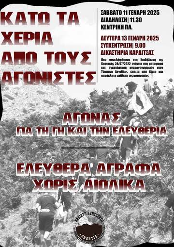 Καλούμε κάθε κάτοικο της Καρδίτσας και των Αγραφιώτικων χωριών, καθέναν και καθεμία που αντιλαμβάνεται το μέγεθος της καταστροφής, που νιώθει την αδικία, που βλέπει τη ζωή του και τη φύση να καταστρέφονται, να συμμετέχει στον αγώνα για την υπεράσπιση των Αγράφων και των αγωνιστών. Αψηφώντας την κρατική βία και τρομοκρατία και αλληλέγγυοι ο ένας δίπλα στον άλλον, δηλώνουμε τη συμπαράστασή μας στους 2 συναγωνιστές μας που διώκονται για την αγωνιστική τους δράση.
